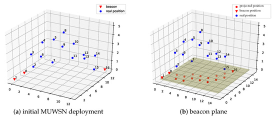 According to the assumption, there are at least three beacons initially deployed to form a triangle, since they are required not on the same line. As shown in the example of Figure 3a, the initial positions of the beacons are given. The non-beacon sensor nodes and these beacons, together with the wireless links between them constitute a three-dimensional fully connected graph.