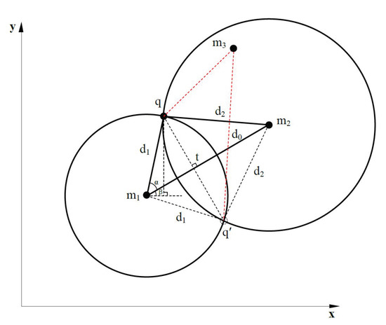 The above equations assumed the scenario that the coordinates of are smaller than those of , as shown in Figure 5. The other scenarios of different values of and are omitted here, as they are similar and different only in the signs of some angles and coordinates. When , the two circles only have a single intersection point, i.e., , t, and q are all on the same line with . The above equations are still applicable. In total, the conditions for applying the above equations are the three localizability conditions mentioned in Section 2.2.