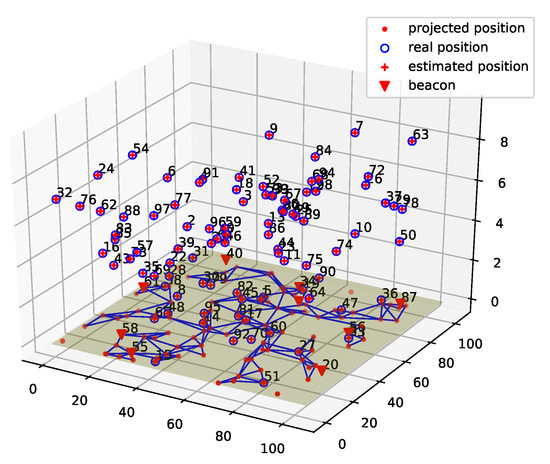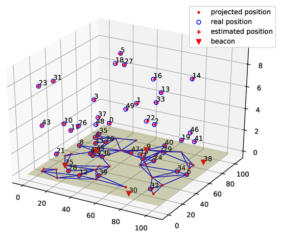 Figure 6 shows the localization result of ProLo for a 50-node five-beacon three-dimensional MUWSN. As can be seen in Figure 6, the localization was performed through projecting the node-distances to the beacon plane. Then, the globally rigid graph was constructed on the beacon plane. It can be seen that all of the locations of the nodes could be calculated correctly. The sensor nodes communicated via multi-hops. The neighbors were connected by edges shown on the beacon plane.