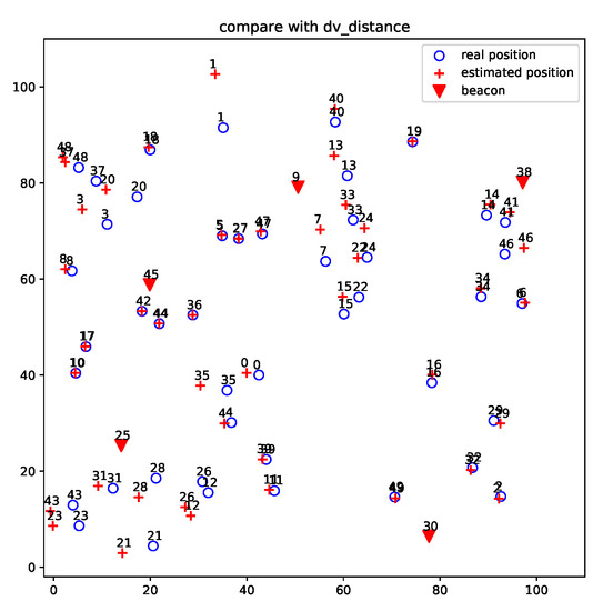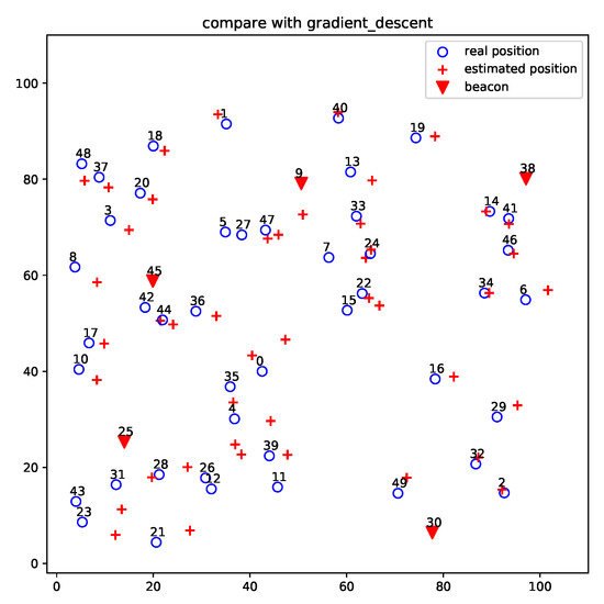 Figure 7 and Figure 8 show the localization results of DV-distance and gradient descent algorithms for the projected 50-node five-beacon MUWSN on the beacon plane in . Apparently, the accuracy of ProLo was the highest. The reason is that ProLo used geometry constraints to directly calculate the correct positions. The other methods using approximation could not get the same accuracy as ProLo.