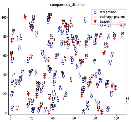 DV-distance result for the projected 100-node 9-beacon MUWSN on the beacon plane in .
