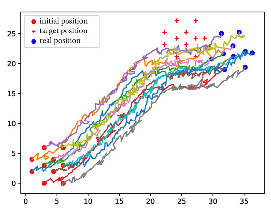 We deployed the nodes in our own simulator. The nodes were controlled to maintain global rigidity while moving in simulation. The trajectory of the nodes from the entrance to the destination is shown in Figure 11. When large errors existed in the velocity and distance measurements, the nodes could not reach the destination accurately. Nonetheless, they could go somewhere around the destination. Moreover, Figure 11 shows that the nodes managed to adjust their positions to maintain the global rigidity of the network.