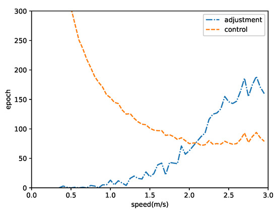 When to adjust the positions of the nodes to avoid disconnection or collision is an interesting topic in the evaluation of our localization-control algorithm. We performed a series of simulations at different moving speeds. The position-adjustment times are shown in Figure 12. The results indicate that the fastest speed caused frequent position adjustments. The optimal speed was approximately 1.7 m/s because the velocity error Was proportional to the speed. When a node was moving too fast, the node was likely to deviate from the intended trajectory, and the deviation might activate a position adjustment. In contrast, moving at a normal speed might slow the deviation. Moreover, the velocity error was random due to the complex environment; therefore, the errors at different periods might cancel each other.