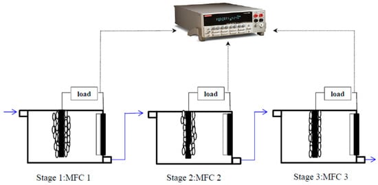 A multistage MFC possesses unique attributes because the unconsumed substrate from the front MFC flows to the subsequent MFC, where the bacteria can continuously consume residual substrate [23]. Such system was applied as a BOD sensor, and results indicated that a wide range of BOD concentrations were obtained [23]. The present study developed a three-stage SCMFC biosensor to increase the range of Cr(VI) measurements in continuous mode. In this study, E. aestuarii YC211 was inoculated into the three-stage MFC system to evaluate its feasibility as a biosensor for in situ and real-time Cr(VI) measurements. Cr(VI) concentrations in leather processing wastewater were also measured using the developed system. To the best of our knowledge, this is the first report of continuous Cr(VI) measurement in leather processing wastewater using an MFC-based biosensor.