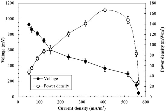 When the potential of the SCMFC reached a steady state (after 19–21 days of immobilization operation), the biofilm in the anode was considered stable or mature [3]. To optimize the SCMFC biosensor’s signal and performance, the effects of external resistance on the biosensor in batch operation were first evaluated. Figure 2 presents the curves of polarization and power density obtained in an SCMFC biosensor during the stable phase of power generation. Results revealed that the voltage of the SCMFC decreased with increasing current density and exhibited a typical polarization curve [27]. A maximum voltage of 926 ± 32.5 mV occurred at 10,000 Ω. For voltage output to stabilize, 20–30 min was required. In addition, the power density of the SCMFC initially increased with current density but started to decrease after a certain point. The maximum power density was 167.5 ± 6.8 mW/m2; the voltage and external resistance were 367.2 ± 42.5 mV and 500 Ω, respectively, under such conditions. Therefore, the external resistance for each MFC within the SCMFC was set at 500 Ω for subsequent experiments [27]. The maximum power density of the SCMFC is superior to that reported in earlier studies (100.1 ± 1.2 mW/m2) using a dual-chambered MFC inoculated with the same strain [7].