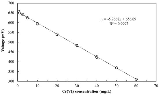 Wu et al. (2017) demonstrated that the performance of a dual-chambered MFC inoculated with E. aestuarii YC211 was not notably affected by water quality measurements (coexisting ions, pH, or NaCl concentration) [7]. Therefore, the effect of Cr(VI) concentration on SCMFC performance in batch operation was evaluated. Under optimal operating conditions, the relationship between the Cr(VI) concentration and voltage output of the SCMFC was characterized. In this study, a response time of 20 min was required to obtain a stable voltage at 500 Ω. Figure 3 indicates that a negative correlation was observed for Cr(VI) concentrations ranging from 0.5 to 60 mg/L. When the Cr(VI) concentration was lower than 0.5 mg/L or higher than 60 mg/L, no linear relationship was observed. The regression equation for Cr(VI) concentration and voltage output of the SCMFC biosensor was determined to be y = −5.7668x + 656.09 (r2 = 0.9997). Wu et al. (2017) using a dual-chambered MFC inoculated with YC211 also observed a linear relationship (y = −2.3256x + 517.15), but their Cr(VI) concentration ranges narrowed down to 2.5–60 mg/L. The higher slope or voltage drop that occurred in our SCMFC suggests the biosensor exhibits some competitive advantages compared with the dual-chambered MFC because of the SCMFC’s relative sensitivity and wide measurement range.
