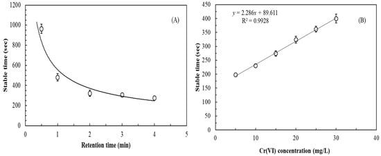 Effects of (A) retention time (anolyte: 1/1000 TSB supplemented with 20 mg/L Cr(VI), external resistance: 500 Ω); (B) Cr(VI) concentration (anolyte: 1/1000 TSB supplemented with different Cr(VI) concentrations, liquid retention time: 2 min, external resistance: 500 Ω) on the stable time of the SCMFC biosensor inoculated with E. aestuarii YC211 in the continuous-flow operation.