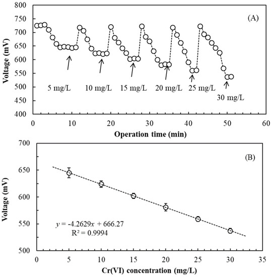 The higher the organic concentrations entering the SCMFC are, the greater the voltages are produced. The higher the Cr6+ or O2 concentrations are in the anode, the fewer electrons are transferred to the cathode, and the fewer voltages are produced. Thus, the potential output will decrease with increasing Cr6+ concentration except in a case of O2 interference. According to the result in Figure 5B, the SCMFC biosensor for Cr(VI) measurement range is 5–30 mg/L; therefore, the theoretical Cr(VI) measurement range of the three-stage SCMFC biosensor would be extended to 5–90 mg/L by cumulating its voltage [23]. Table 1 lists Cr(VI) measurements of the effluents of eight leather processing units (A–H) by three-stage SCMFC biosensor in continuous-flow operation and using colorimetric method in batch operation. Results indicated a higher deviation (>12%) in the Cr(VI) measurement of effluents of units A and H (2.6 and 124.5 mg/L) by our system compared with the colorimetric method. This can be explained by the fact that the measurement range was not within the optimal 5–90 mg/L measurement range. A lower deviation (<7%) was observed in Cr(VI) measurement from effluents of units B–G (6.8–84.2 mg/L) by our system compared with the colorimetric method because these units’ concentrations fell in the measurement range. Compared with the deviation (−1.2%–0.44%) of Cr(VI) measurement of artificial wastewater using a similar system (Figure 6), Cr(VI) measurement of actual wastewater is less accurate, mainly because of the effects of BOD and DO in the wastewater [28].