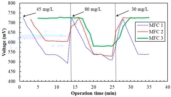 The SCMFC biosensor could accurately determine 5–30 mg/L of Cr(VI) at 2-min LRT in continuous-flow operation. To expand the Cr(VI) measurement range, a three-stage SCMFC biosensor or system (Figure 1) was developed to determine the Cr(VI) concentration from artificial and actual tannery wastewater. Figure 6 presents the effect of Cr(VI) concentrations sequentially fed to the system on the voltage output of the SCMFC. In the first stage (through 14 min), the initial voltage in MFC 1 was 725 ± 10.5 mV; it gradually decreased and stabilized at 536.5 ± 2.8 mV between 6.6 and 10 min while 45 mg/L Cr(VI) was introduced. The voltage output (536.5 mV) of MFC 1 converted to Cr(VI) concentration in artificial tannery wastewater was 30.44 mg/L according to the regression equation presented in Figure 5B. After 3 min of operation, MFC 2 received the wastewater from MFC 1, and the voltage in MFC 2 gradually decreased before leveling off at 606.5 ± 5.1 mV during minutes 7–13. The Cr(VI) concentration in the artificial tannery wastewater was calculated as 14.02 mg/L. After 4 min, the MFC 2 effluent flowed into MFC 3; the lack of voltage change indicated a zero Cr(VI) concentration. Therefore, the inflow Cr(VI) concentration was reduced in the three-stage SCMFC biosensor, and the value was 44.46 (30.44 + 14.02) mg/L.