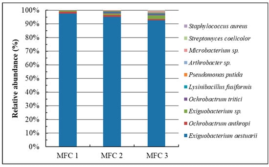 To understand the changes in the bacterial community of the three-stage SCMFC biosensor after operation, the biofilm at the anode was analyzed through NGS [29]. Figure 7 indicates the relative abundances of the bacterial 16S rRNA gene sequences in three separate SCMFCs (MFC 1, MFC 2, and MFC 3) after measuring the Cr(VI) concentration from the effluents of eight leather processing units. At first, E. aestuarii YC211 alone was inoculated in the three-stage SCMFC. After the SCMFC system was used to treat the wastewater, the bacterial community in MFC 1 was the simplest, and only four strains were observed: E. aestuarii (97.5%), O. anthropi (1.45%), Exiguobacterium sp. (0.92%), and O. tritici (0.13%). These four strains are classified as Cr(VI)-reducing bacteria [7,10,30,31]; thus, they can endure relatively high Cr(VI) concentrations. The complexity of the bacterial community in MFC 2 was the second simplest, and the community increased to seven strains. The strains included Lysinibacillus fusiformis, Pseudomonas putida, and Arthrobacter sp. in addition to the four strains that existed in MFC 1. The Cr(VI)-reducing capability of these three strains has been reported [32,33,34]. In MFC2, the dominant strain remained E. aestuarii (95.12%), and other strains were represented at <1.5%. The bacterial community in MFC 3 was the most complicated because the inlet Cr(VI) concentration was the lowest. The bacterial community increased to 10 strains. The strains comprised Microbacterium sp., Streptomyces coelicolor, and Staphylococcus aureus and the seven strains that existed in MFC 2. These three new strains have been regarded as potential Cr(VI)-reducing bacteria [4,35,36]. In MFC 3, the dominant strain was E. aestuarii (92.54%), and other strains were represented at <3.0%. The results of the aforementioned studies demonstrate that reliable three-stage SCMFC performance (<7% deviation) should be attributed to a stable bacterial community (>92.5% original strains) present during the treatment period (four months).
