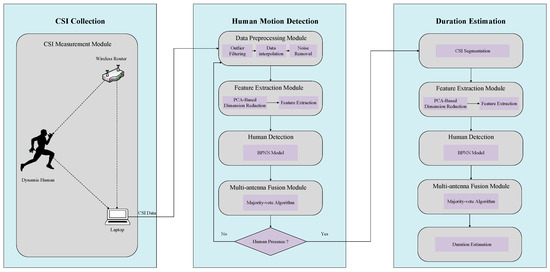 Then, there is a human motion detection process for each CSI segment, including the feature extraction, BPNN, and multi-antenna fusion module. Moreover, the duration of each CSI segment is defined as a window size, , if the CSI segment is confirmed as a presence in the scenario; otherwise, it should be defined as the value of zero.