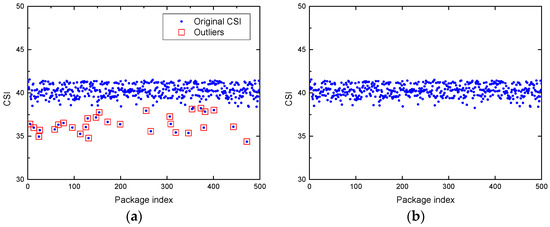 Outlier filtering and data interpolation for CSI measurement in the absence scenario: (a) The original CSI data of subcarrier 1 with outliers; (b) the CSI data of subcarrier 1 after outlier filtering and linear interpolation.