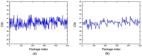 Noise removal for the CSI measurement in the presence scenario: (a) The raw CSI measurement; (b) the CSI measurement after removal with the wavelet-based denoising.