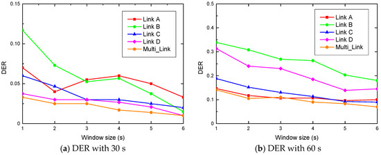 We also observed that the DE rate decreases with the increase of the window size. This is because the variance of a CSI segment changes more obviously as the window size is enlarged. In this case, when the variance of a CSI segment is much smaller than the human motion duration, the system is more sensitive to the moving information. Furthermore, it can be seen that we cannot identify which single antenna link case has the worst or best performance of DER. This is because there is no stable sensitivity for all single wireless links to detect human motion under any situation. Furthermore, it is evident that the mean fluctuation of DER in the graduate dormitory is smaller than that in the research laboratory. This is because of the difference in the space distribution, which is the same reason for the TPR trend differences. There is less multi-path impairment when the smaller enclosed scenario is adopted for the experiment.
