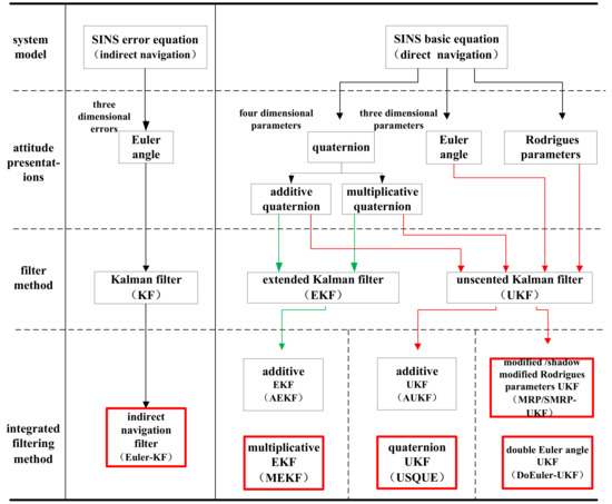 We can apply linear or nonlinear Kalman filters in inertial integrated navigation. These filters are called integrated navigation filters. However, this filtering application is not straightforward because integrated navigation filters have their own particularities in terms of attitude representations. Among the integrated navigation filters, the attitude representations vary. The common representations are rotation angles, the Euler angle, and the family of Rodrigues parameters, such as modified Rodrigues parameters (MRP), and quaternion [26,27]. The earliest integrated navigation filter was constructed from the Euler angle and inertial error equations, which is called Euler-KF in this paper. Since the inertial error equations are linear, the Euler-KF uses KF for filtering. Thus, the Euler-KF is simple and easy to apply. The application of Euler-KF can be traced back to the Apollo moon landing program. In the field of integrated navigation, the Euler-KF is traditionally called indirect integration due to its integrated structure.