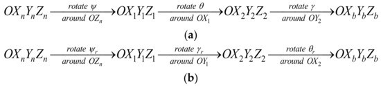 The coordinate frame is the research foundation of SINS. The SINS attitude transformation matrix is usually related to two important coordinate frames: body frame (b-frame, Right-Front-Up, RFU) and navigation frame (n-frame, East-North-Up, ENU). The b-frame is fixed onto the vehicle body and rotates with it. The outputs of IMU are expressed with respect to the b-frame. The n-frame is the reference frame that performs navigation calculation. Other coordinates used in this paper are the Earthframe (e-frame) and the inertial frame (i-frame). The outputs of IMU of SINS should be transformed from b-frame to n-frame for navigation calculation using the attitude transformation matrix. The vector rb with respect to b-frame can be transformed to rn with respect to n-frame: