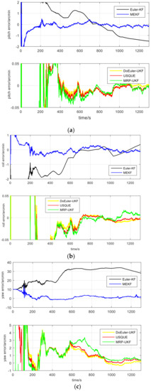 (a) Pitch errors of each filter in ME2; (b) Roll errors of each filter in ME2; (c) Yaw errors of each filter in ME2.