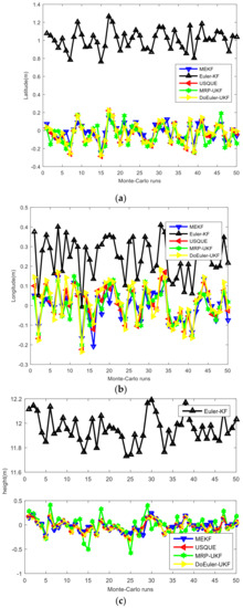 (a) Latitude errors of each filter; (b) Longitude errors of each filter; (c) Height errors of each filter.