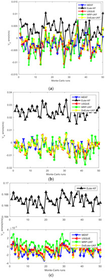 where is the reference state, is the estimate, k is the number of simulation, and m is the number of Monte-Carlo runs. In this test, ME1 was used for the position and velocity estimates and ME2 was used for the attitude estimate. The initialization conditions are shown in Table 4.