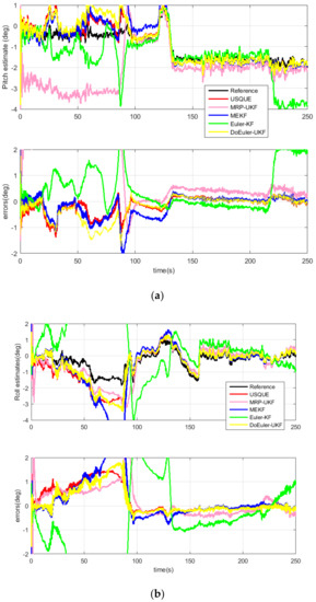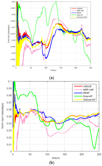 According to the experiment, both in attitude and gyro bias, it is found that the estimation performance of USQUE is better than MEKF. This is because the MEKF algorithm uses the same model as USQUE. However, in the attitude estimation part, in order to calculate the Jacobian matrix, the approximation is used instead of , with some precision loss. In addition, the use of the Jacobian matrix also has loss of precision, and Euler-KF uses the SINS error equation. The model makes some approximations in the linearization process, so that although the Kalman filter is optimal in the linear model estimation, because of the model’s precision loss, the estimation accuracy is the worst. The accuracy of the model and calculation method is a double-edged sword. The high precision comes at the cost of calculation. DoEuler-UKF has a high estimation performance both in accuracy and computation time. When comparing with USQUE, the accuracy is almost equal and the computation time is half, because of the Euler-angle having less computation than quaternion. When using the MRP-UKF estimate of pitch and roll, the accuracy is pretty good, but when estimating gyro bias, the accuracy of MRP-UKF is a little poor.