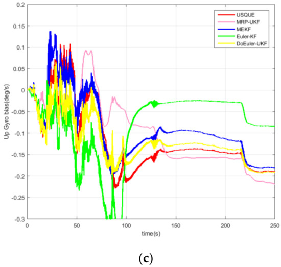 (a) East gyro bias estimate of each filter; (b) North gyro bias estimate of each filter; (c) Up gyro bias estimate of each filter.