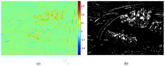 After that, a threshold should be set to remove the decorrelation areas in the estimated frequency result, so two classes including layover candidates and rests are segmented. According to the statistical distribution of the estimated local frequencies, an empirical threshold is defined. Figure 3c,d illustrate the statistical distribution of the estimation values in the layover area, and other area, respectively. Apparently, the local frequency values in the layover area are irregular and most are larger than zero. Whereas in non-layover area, the values are nearly distributed regularly viz the zero-centered symmetry. Figure 3b shows the statistical distribution of the local frequency value in Figure 3a, the distribution center is still at zero but in asymmetry distribution. Thus, t = 0.02 is set as the empirical threshold, because from this value the symmetry distribution is destroyed. Figure 4a illustrates the layover candidates and rests by thresholding, and the values of rests lower than 0.02 are set to be zeros while the layover candidates keep their values.