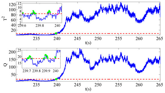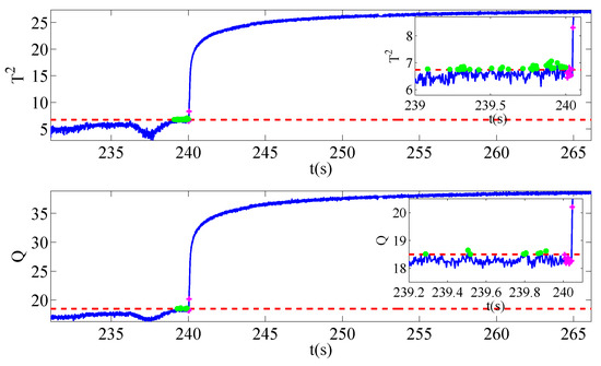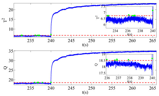 The detection indexes of various sensor faults with MMRNPE and NPE shown in Table 3 can obviously verify the superiority of our MMRNPE, especially when it comes to statistics . The results of FAR, NDR and TDR with performance statistics perform better accuracy of fault detection. Furthermore, with a careful observation of the magnified figures, it is apparent that several misclassifications occur. To be more specific, the non-detection point may be marked in the fault alarming notation after the fault is injected while the fault alarming point may be marked in a non-detection notation before 240 s. Such mistakes take place due to the setting of sampling time. The sampling time is s, which will make it difficult to inject the sensor faults exactly at 240 s, i.e., the injected time 240 s is between sampling points m and .