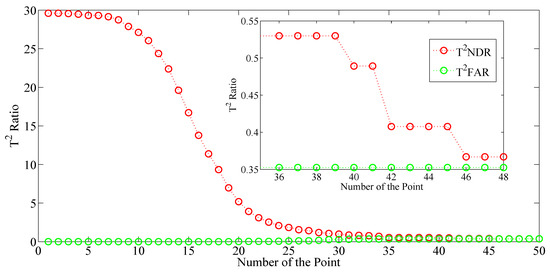 Now that MMRNPE seeks a latent variable space that represents the high dimensional space relatively, the monitoring statistics Hotelling’s statistic is constructed as a measurement of the performance of fault detection [40,41]. Here is the definition of :