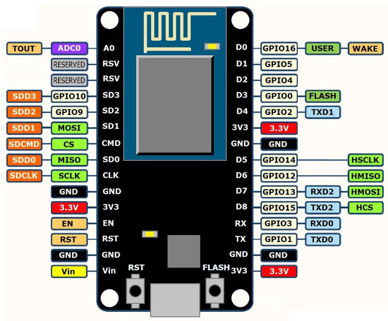 Pin distribution of the WiFi wireless sensor networks (WSNs) development board node micro controller units (MCUs) ESP8266 (MCU-ESP8266) embedded system.