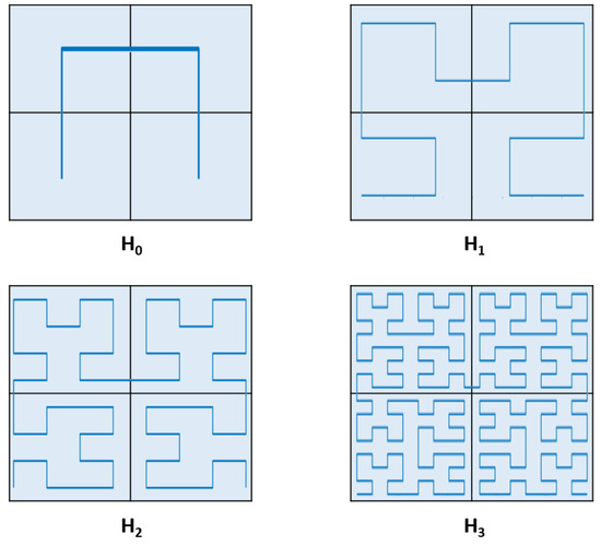 The curves that fill the plane that contains them do so in a specific order by continually changing direction or passing through each point that is in the defined space [17]. There is a type of fill-space curves that satisfies the following conditions: (i) curves in a single layer that do not intersect, (ii) each point in the curve is at a constant distance unique to any other point, and (iii) there is only one starting point and one stopping point of the curve in a single layer. These curves have been widely studied more than a century ago in various fields such as mathematics, information processing, data consulting or image compression. The Hilbert fractal is a fill-space curve that satisfies these three criteria and it can be generated by using specific rewriting rules of the L-systems [18].