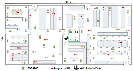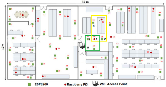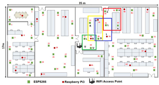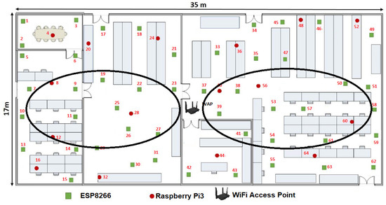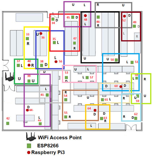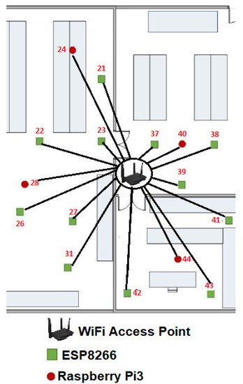 As shown in the Figure 10, our floor plan sample had some walls, which attenuated the signal. That is why certain devices with shorter linear distance have a slower maximum speed than others that are further away from the WPA. Perhaps, MCU-ESP8266-26 was 3.50 m from the router and it can transmit packets at a speed of 195.09 Mbps, while the MCU-ESP8266-43 was 3.75 m but it was linked to 199.39 Mbps, this is due to the vertical wall that divides this room.