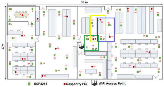 The Hilbert fractal has a closed dimension of two, which is why it is an ordered way to pass any matrix to an ordered vector according to its nearest neighbor and to its speed. This additional parameter gives the sensor network a primary artificial intelligence that optimizes its connection and reconfigures according to the members that are included or disappear from the network. The position inside the WSN of each is showed by Figure 8b, where is the last reconfiguration or stabilization of the WSN. For example, we can highlight that the most efficient way to communicate with is forwarding all the packages to the , then to to finally reach , instead of just sending the information directly to , see Figure 16. Also in this figure we can highlight the position of each inside this particular floor plan is optimized by the reliable bandwidth. Namely, the best way to communicate any is sending the information to the or . This increases the average bandwidth in the WSN because this set of devices, behaving as a single entity, is able to find an intelligent way to share all the parameters that these devices can measure or estimate. In this way, Figure 16 depicts the half of the floor plan for a visual representation of the ring sorting by applying the production rules of the Hilbert fractal using only the alphabet of second order.