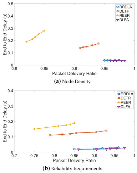 Thus, Figure 18a,b show the comparison between PDR vs E2ED in terms of node density and reliability requirements, respectively. We can highlight that the higher E2ED, the better while the lower PDR, the better. So, both algorithms RRDLA and this proposal obtain the best results and they try to minimize the delay to transfer the event information when destination node can recover the original packets. DLFA is slightly better in both cases, but the differences are not higher than the 2%. In addition, we can notice that the delay both in RRDLA and DLFA remains almost fixed by increasing the node density in the network or the QoS. Both DETR and REER obtain results very far from the two best algorithms.