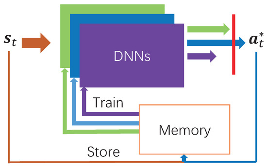 The architecture of DDLO is illustrated in Figure 2, which is composed of B DNNs and a shared finite-sized memory structure. At each time slot t, it takes system state as the input and outputs a binary offloading decision . Specifically, each DNN generates one candidate offloading action , as