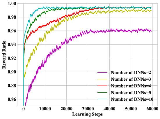 In Figure 4, we study heterogeneous DDLO under different number of DNNs. The more DNNs used, the faster heterogeneous DDLO converges, which requires more parallel computing resources. A small number of DNN may converge to local optimum, e.g., when the number of DNNS equals to 2. Note that, as reported in [23], DDLO cannot converge with a single DNN.