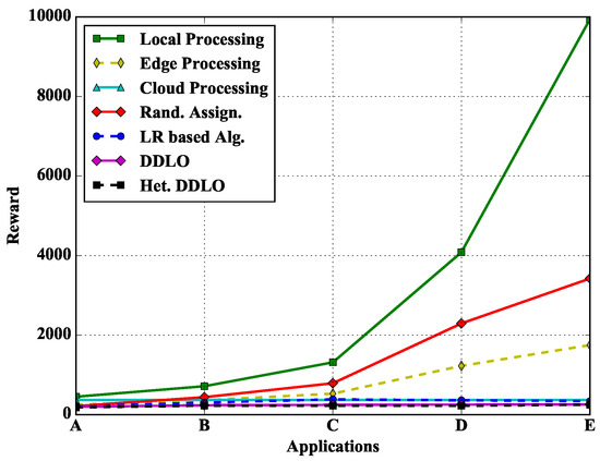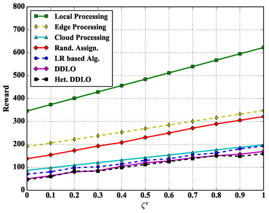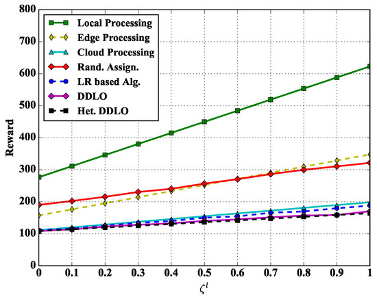 We set the energy scalar and latency scalars as constants and in Figure 8 and Figure 9, respectively. With the increase of delay scalar and , the reward values of all policies increase. The Local Processing policy generates largest reward while both DDLO and heterogeneous DDLO outperform other offloading policies. When , the system reward only considers the latency, and the Cloud Processing policy takes longer time than other integer offloading policies, e.g., LR-based algorithm and heterogeneous DDLO.