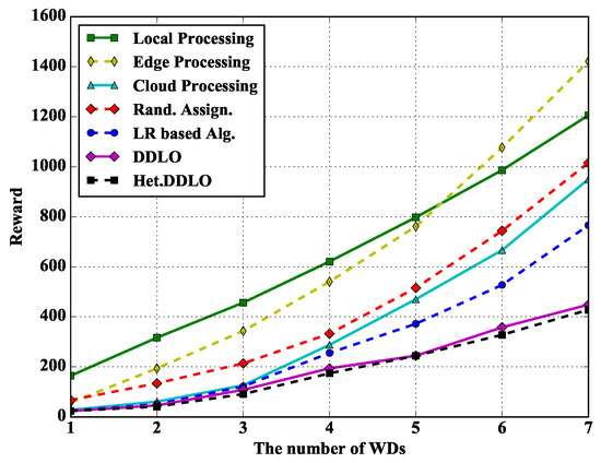 In Figure 10, we study the performance of different policies under different number of WDs. Heterogeneous DDLO outperforms LR-based algorithm. With the increasing number of WDs, the total reward of Edge Processing policy grows faster than other offloading policies because more users will jointly occupy one edge’s resources, resulting a low processing speed.