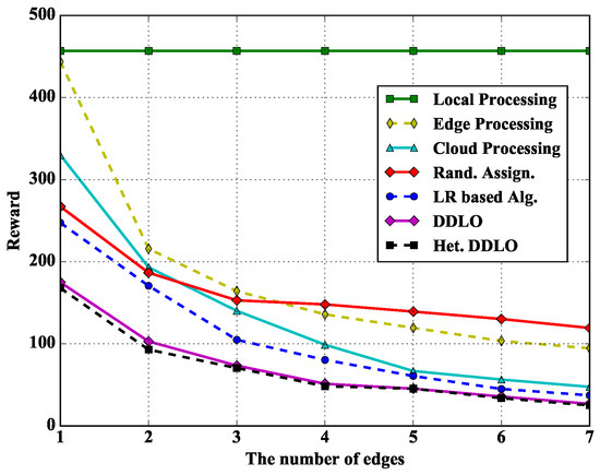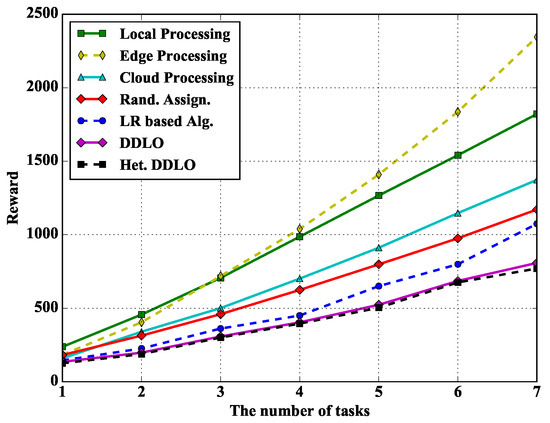 In Figure 11, we study the performance of different policies under different number of tasks. With the increase of the number of tasks, the total reward of Edge Processing policy grows faster and faster. Because when an edge server processes multiple tasks at the same time, its processing units are shared among all tasks. DDLO and heterogeneous DDLO outperform other offloading policies.