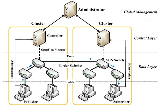 In SDN, the forwarding plane is separated from the control plane. The control layer is composed of logically centralized controllers, network switches become simple packet forwarding devices. In this way, SDN simplifies the design and management of networks, and makes the network have more programmability and flexibility. We propose an SDN-like pub/sub system architecture, as shown in Figure 1. The system includes one administrator and several clusters. The administrator is responsible for the global network management and interacts with the controller of each cluster. A cluster contains a controller, several switches, publishers, and subscribers. Border switches are used to interconnect clusters. Users communicate with the system by Web Service Notification (WSN).
