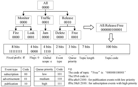 In our topic-based pub/sub system, topics are represented as a Lightweight Directory Access Protocol (LDAP) topic tree. The topic, event type and queue priority are encoded into binary strings of the 128 bits IPv6 multicast address in the header of packets. They are used to match flow tables directly when forwarding. If the IPv6 destination address match the flow entries, the events will be forwarded; else they will be discarded. We use 100 bits of IPv6 address to encode the topics. If the number of bits of the topic code is less than 100, we fill them with 0. The encoding rules are shown in Figure 2.