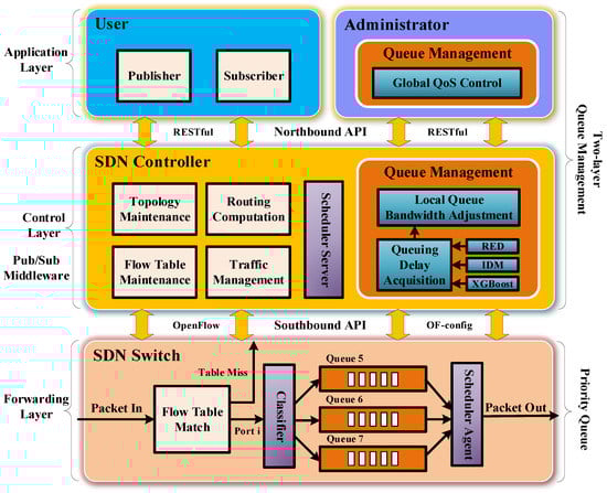 On the SDN controller, we get the queuing delay using three methods: the RED method, IDM, and the XGBoost model, then we use the delay to implement the local queue bandwidth adjustment. The SDN controller communicates with SDN switches using the southbound APIs, such as the OpenFlow protocol [] and the OF-config protocol []. It interacts with the application layer by the northbound APIs, such as REST APIs. The priority queue is mainly implemented in SDN switches.