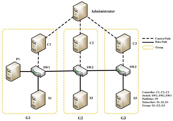 We use three SDN-enabled physical switches and several PCs to setup the experiment topology as shown in Figure 4. Each OpenDayLight controller is connected to one or more switches through the OpenFlow protocol. Each SDN controller, switches, and some hosts form a cluster such as G1. The switch model is Pica8-p3290, which can support OpenFlow1.4, Open vSwitch2.3, 48 ports, 8 priority queues, IPv6. The bandwidth of each switch port is 100 Mb/s.