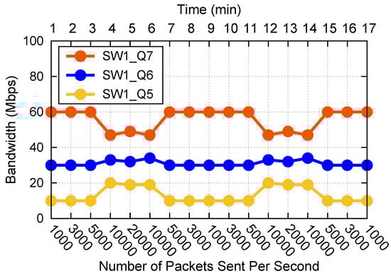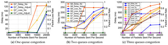 We take queue 7 as an example. This queue has the high priority with an initial bandwidth of 60 Mb/s. As shown in Figure 12a, when the background traffic is added to the experiment, the delay increases, and the packet loss rate is also larger than the control group. The experimental group first triggers the bandwidth adjustment algorithm. For example, when the packet frequency is 15,000 pps, the delay begins to decrease for the experimental group, but for the control group, when the value is 20,000, the delay begins to decrease. In Figure 12, the queue bandwidth adjustment algorithm is triggered when the frequency is 5000 for the experimental group, but for the control group, when the value is 10,000, the bandwidth of queue 7 begins to increase. Therefore, our two-layer queue management mechanism is effective, as the bandwidth of queues can be adjusted dynamically under the background traffic.