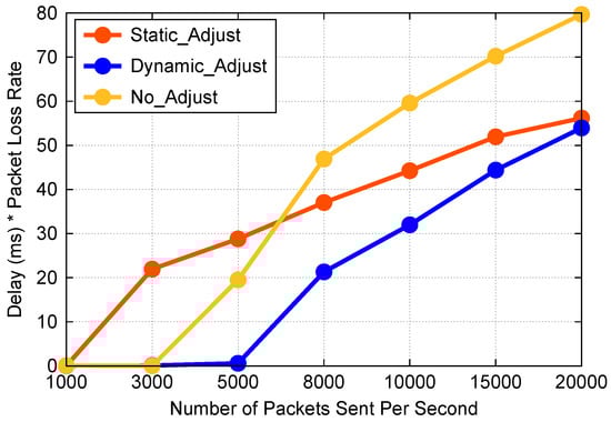 In the local queue bandwidth adjustment algorithm overall test part, the hard problem is how to evaluate the overall performance of the algorithm. Because delay and packet loss rate complement each other, when one declines, the other will rise. For example, if we process packets quickly, the end-to-end delay will decrease, but the packet loss rate will increase due to congestion coming early, so we designed a new metric to reflect system performance comprehensively, namely, the product of delay and packet loss rate. The area formed by the curve and two coordinate axes in Figure 7 reflects the performance of the system to some extent.
