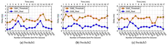 The OpenFlow protocol provides standard specifications for interactions between SDN controllers and switches. However, the support for queues is very limited, it does not provide a method to obtain the real-time length of the switch port queue, so we cannot get the queuing delay directly. The RED method [] uses Equations (4)–(6) to get the queuing delay.