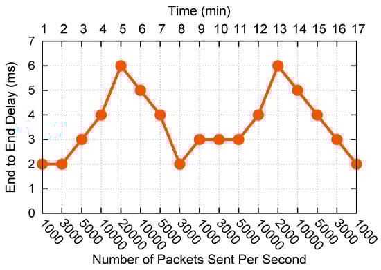For traffic generation, we adopt the Distributed Internet Traffic Generator (D-ITG) [,], which has been proven to work reliably than other traffic generation tools []. It can generate the realistic network workload for emerging networking scenarios. We can get the D-ITG log files after running D-ITG tools. Some average metrics about the network can be dumped as sampled every few milliseconds. In these experiments, we set the time to 1000 milliseconds, namely, one second. Each line of the output file consists of these fields respectively: Time, Bitrate, Delay, Jitter, and Packet loss. It is very convenient to evaluate network performance by D-ITG, because we can get experiment results directly without complex calculations. In this paper, we use D-ITG to define two traffic scenarios: