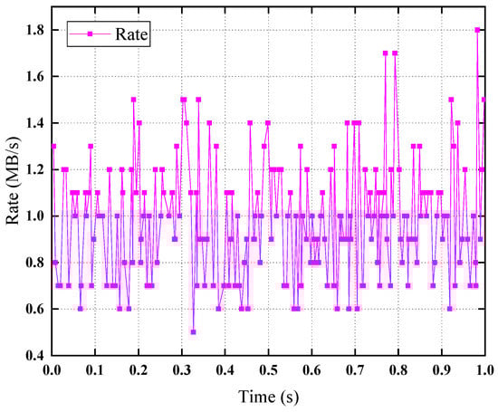 The Poisson background traffic model curve is shown in Figure 11. In one second, there are about 200 time intervals (points), the intervals follow the exponential distribution, the rate varies around 1 MB/s uniformly, this also meets the characteristics of the Poisson distribution.
