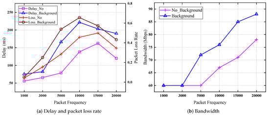The comparison of the Poisson background traffic and no background traffic is shown in Figure 12. We conduct two sets of experiments to verify the effectiveness of our two-layer queue management mechanism. One uses the Poisson network traffic model to generate the background traffic, the other one is a control group without the background traffic. The packet size is 1 KB. The packet frequency is the number of packets sent per second. We use different packet frequencies to increase the traffic in the queue. When this value is large enough, the network can generate congestion, then the queue bandwidth adjustment algorithm is triggered to adjust the bandwidth of queues, at last, the delay will become small, and the packet loss rate will decrease. We continue to send each kind of packet for one minute to simulate the long-term network congestion.