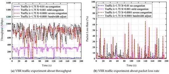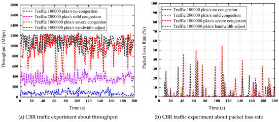 The experiment results are shown in Figure 14. Figure 14a presents the traffic from P1 to S1 with different Pareto distribution parameters. Figure 14b presents the packet loss rate about the four flows. For the first flow, there is no packet loss, the throughput is relatively stable. For the second flow, there are some packet losses, the network is in mild congestion, but sometimes the throughput fluctuates considerably, and can be close to 0, this is different from the CBR experiment because the packet rate is changing in Pareto distribution. For the third flow, both the throughput and the packet loss rate fluctuate greatly, the throughput can be 17.54 Mbps, which is close to 0 at the 47th second in the curve, as shown in Figure 14a, and the packet loss rate can be , as shown in Figure 14b. These data indicate that the network is seriously congested. After bandwidth adjustments, the throughput becomes relatively stable and larger, and the packet loss decreases too, as shown in the fourth flow in Figure 14. These data verify the effectiveness of our bandwidth adjustment methods.