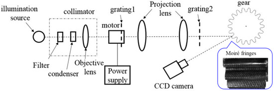 Figure 2 illustrates the framework of the proposed projection moiré technique established in this study, and Figure 3 displays the setup of the optical measurement system on the optical bench. As exhibited in Figure 2, a halogen lamp was used as the illumination source, and the collimated beam was produced by a collimator. As Figure 2 and Figure 3 illustrate, two projection lenses were used to enlarge the projected fringe period from grating 1, to form the moiré fringes with fringes projected from grating 2 on the tooth surface. Subsequently, the moiré fringes were built up on the gear tooth surface as the collimated beam passed through the two linear gratings. A linear stage driven by a servo motor enabled us to move grating 1 in the five-step phase-shifting. A CCD camera was used to capture the images of moiré fringes formed on the gear tooth surface. Table 1 summarizes the major components of the projection moiré system used in this study.